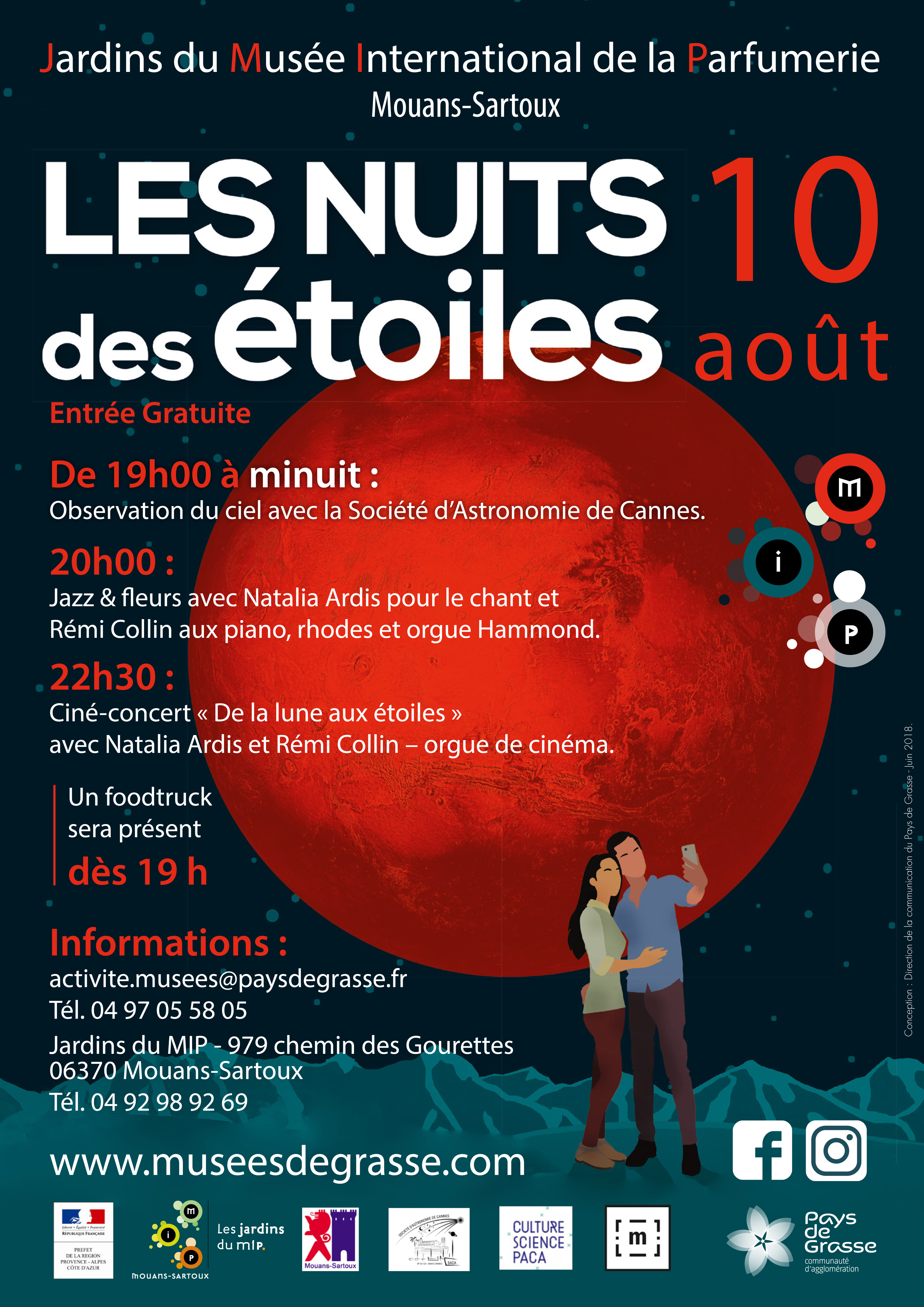 Pour la 28e édition de « Les Nuits des Étoiles », portée par l’Association Française d’Astronomie (AFA), les Jardins du Musée International de la Parfumerie (Mouans-Sartoux) vous invitent à venir vendredi 10 août 2018 contempler la voûte céleste. Une opportunité pour observer les planètes Jupiter, Mars et Saturne, ainsi que les traditionnelles constellations estivales avec les Associations d’Astronomie de Cannes et de Mouans-Sartoux. Et bien entendu les étoiles filantes seront au rendez-vous !